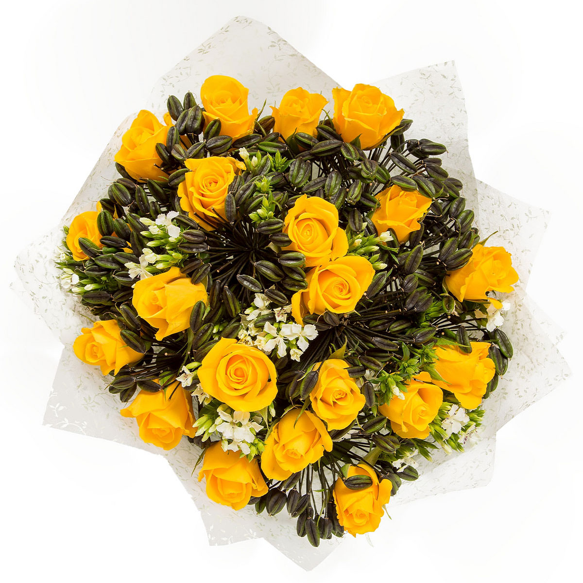 Роза одноголовая жёлтая, зелень. Упаковка (лента, пленка, крафт, сетка, пленка матовая)