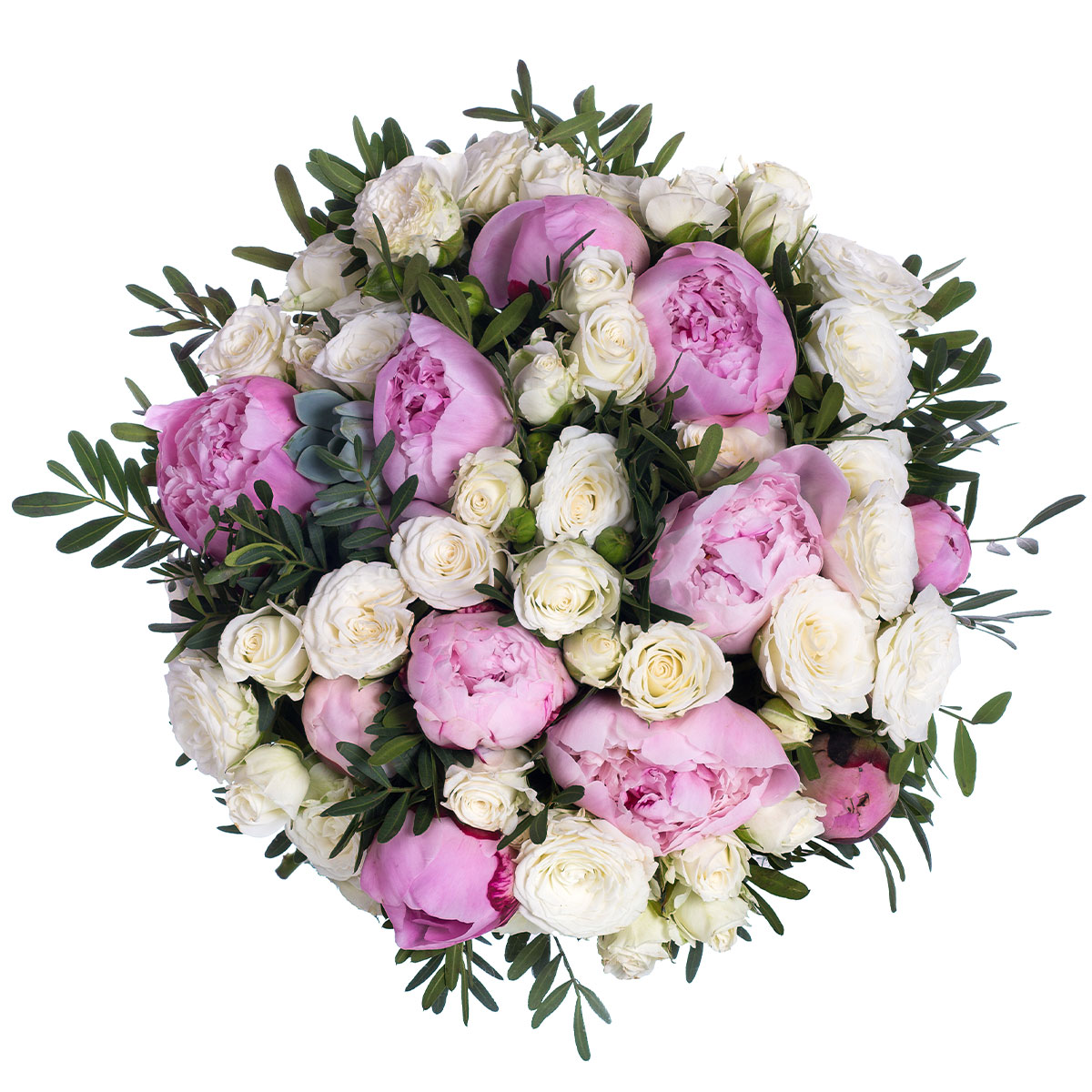 Пион розовый, роза кустовая белая, фисташка, зелень. Упаковка (лента, пленка, крафт, сетка, пленка матовая)